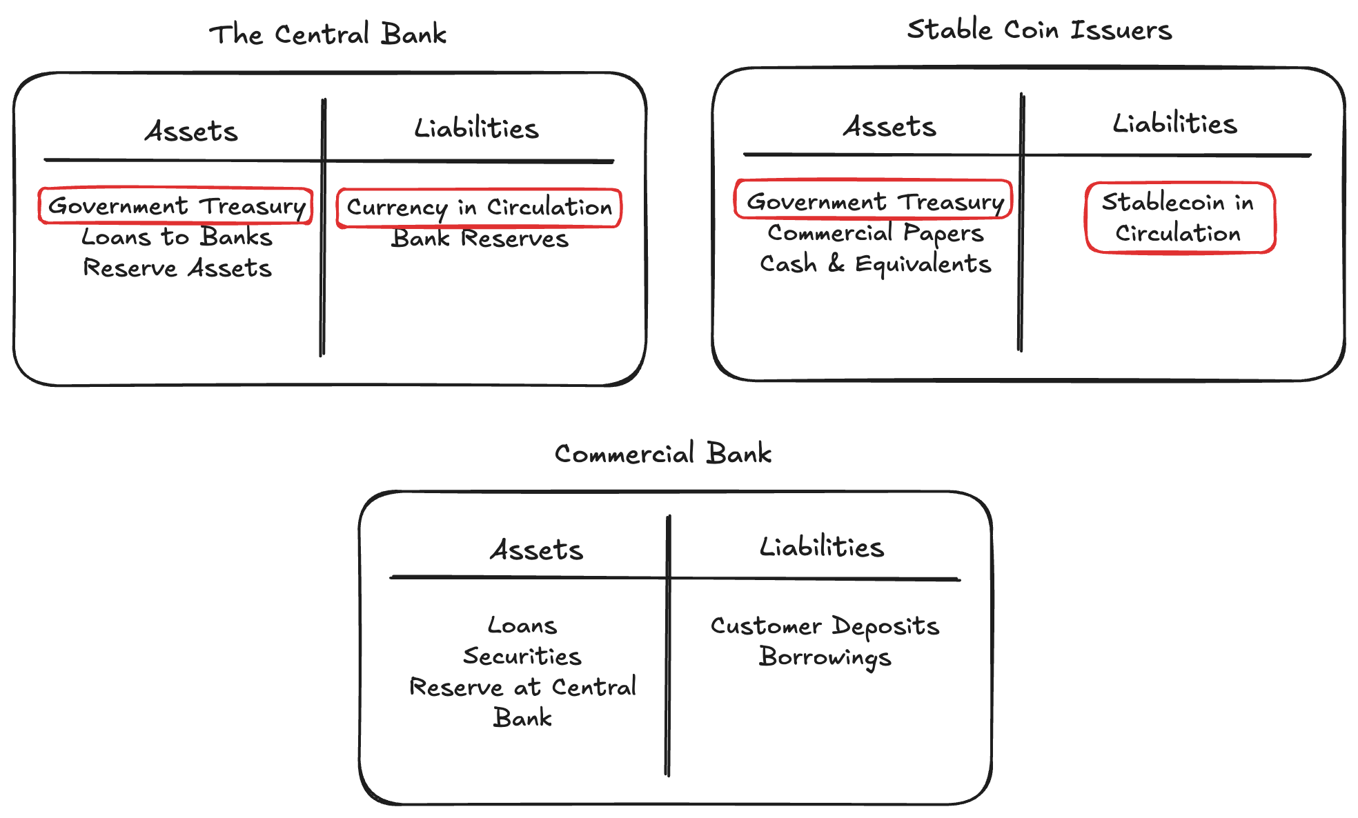 When we look at the Balance Sheet of companies like Tether or Circle, they have US treasuries on their Asset Side and Stablecoins issued on their Liabilities Side much like a Central Bank. Here’s a snapshot of the balance sheets of the Central Bank, a stablecoin issuer and a bank side-by-side: