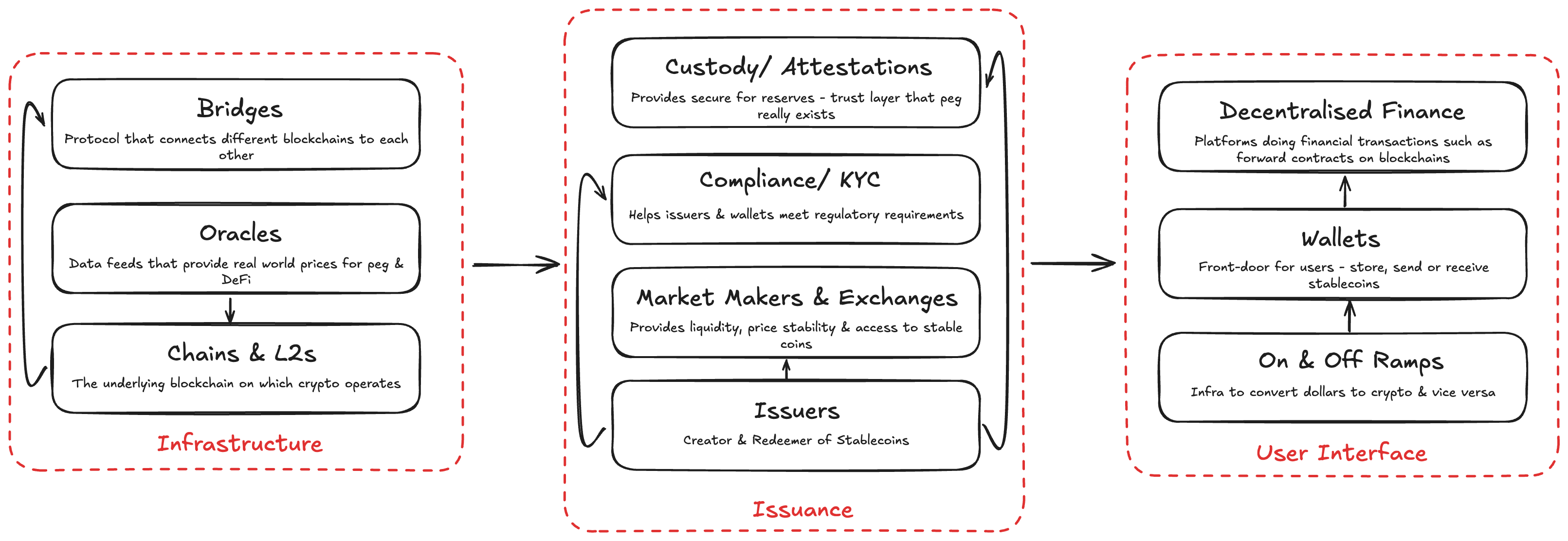 • There are the firms that actually create stablecoins. These are typically regulated fintechs, crypto companies or even traditional finance companies. They guarantee the fiat peg and are the foundational trust layer for stablecoins. These firms typically earn through the interest rate earned from the reserve bonds, transaction fees or some partnerships.
