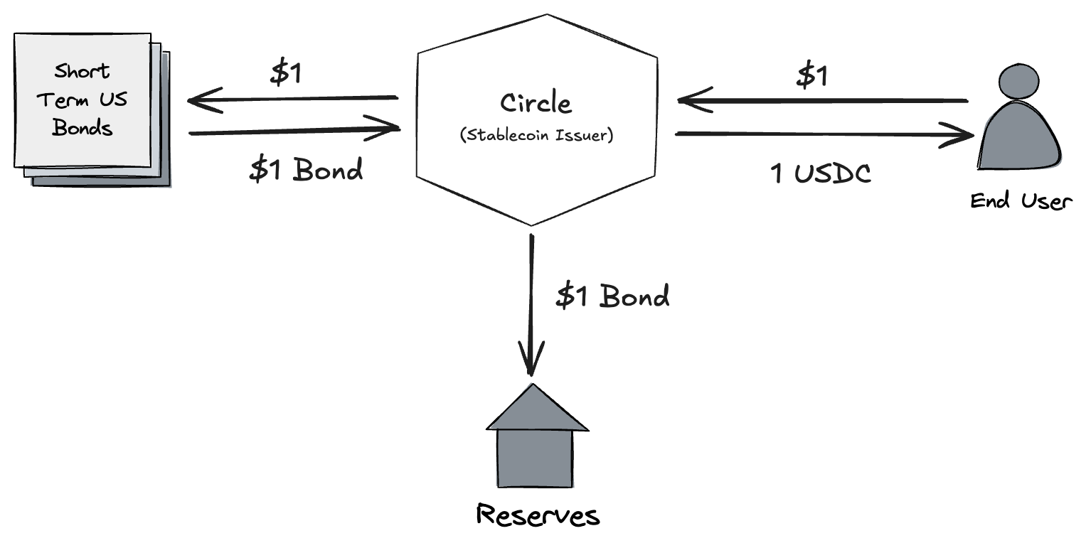 Let’s understand stablecoins more fundamentally through the example of the 2 most widely used (~90% market share) coins - USDT (issued by Tether) and USDC (issued by Circle). Imagine you purchase $1 worth of the stablecoin USDC from Circle. They will take your $1, issue you stable coin worth $1 and simultaneously buy short-term US Treasury Bills worth $1. Thus, your coin is 1:1 pegged to the US Treasury. When you redeem that USDC, Circle sells the Treasury bill (or equivalent reserve asset) and returns your dollar. Hypothetically, the peg could be 1:10 or 1:100 as well, but to build trust in the system, the 2 top players (Circle & Tether) are going with a 1:1 peg with the treasury bills. Stablecoins can be thought of as tokenized dollars (or gold, or bonds) that work on crypto rails. They carry the stability of traditional finance, but with the programmability, speed, and borderless reach of blockchains.